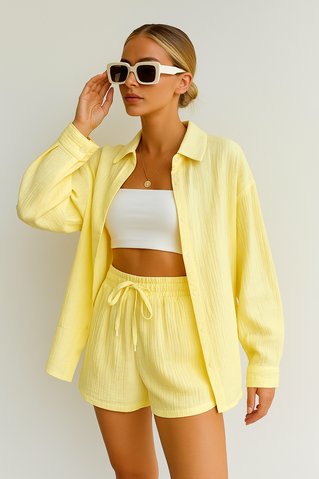 Loose-fit silhouette with regular-length shirt and mini shorts