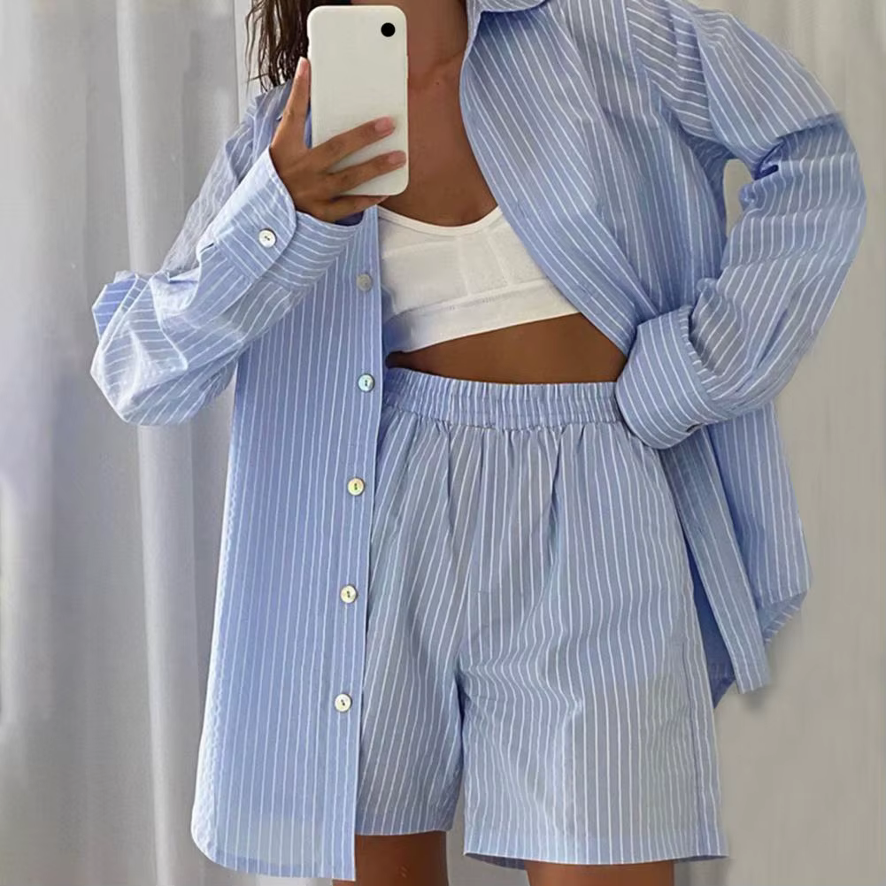 Effortless and breezy, this striped summer set combines laid-back charm with a polished twist. Featuring a long-sleeve button-up shirt and high-waisted mini shorts, it's your go-to outfit for warm-weather lounging or elevated casual days.